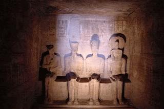 In the sixth hour and twenty five minutes in on Feb. 21, or five o'clock and fifty-five minutes on 21 October each year sneaking Sunbeam to fall over the face of King Ramses flood of light fills portrayed the pharaoh inside his room in the Holy of Holies in the heart of the temple, and then multipliesSunbeam quickly component beam of light shining and the four faces of the statues inside the Holy of Holies.